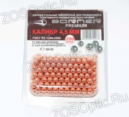 Пули сферические, "BORNER-Premium", омедненные, кал. 4,5 мм (блистер 250 шт.)